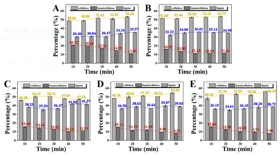 (A–E) The percentage of lignin, cellulose, and hemicellulose of bamboo slices after the saturated steam heat treatment with different initial moisture content.