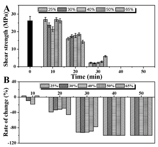 The changes in shear strength (A) and corresponding change rate (B) with heat treatment time.