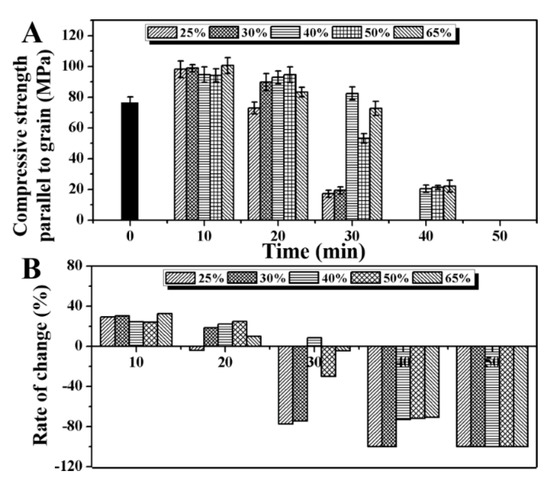 (A) Results of compressive strength along grain of bamboo before and after saturated steam heat treatment under different moisture content conditions, and (B) the change rate with the prolongation in heat treatment time.