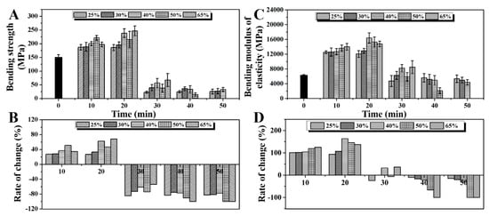 Figure 6A,B show the bending strength of bamboo after saturated steam heat treatment with the prolongation in heat treatment time and its change rate with time. It can be seen from the figure that in the first 20 min, the bending strength of bamboo shows an upward trend. The change rates of the bending strength of bamboo with an initial moisture content of 25% to 65% after 10 min saturated steam heat treatment are +27.77%, +28.71%, +36.79%, +51.19%, and +34.81%. After 20 min, the change rates of bending strength are +26.95%, +33.49%, +62.96%, +46.87%, and +68.69%, respectively. This phenomenon is basically consistent with the change rule of the compressive strength along the grain of bamboo. The decrease in bending strength of treated bamboo is mainly due to the degradation of hemicellulose interpenetrating between microfibrils and bonding with lignin during saturated steam heat treatment, so the bamboo becomes brittle and the bending strength decreases.