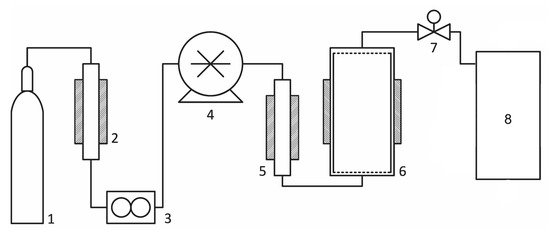 Schematic diagram of SFE-1000 extraction system. 1: CO2 cylinder, 2: cooling heat exchanger, 3: Koriolis flowmeter, 4: two-piston high-pressure pump, 5: electrical heater, 6: 1 L extraction vessel with an electrical heating jacket, 7: manual backpressure regulator, 8: collection system.