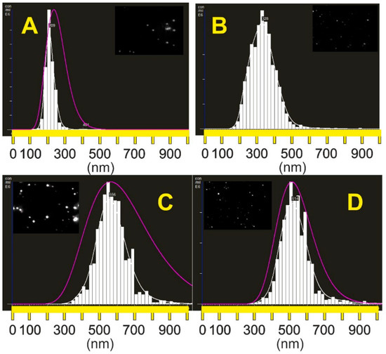 Particle size distribution of core H10 and H14 (A,B), core–shell H26 and H27 (C,D) particles obtained by NTA (pink curve—DLS Nanosight NS500 results; NTA video frames are shown in the inserts).