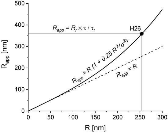 In Table 4, we list the parameters required to estimate the actual hydrodynamic radii of fluorescent particles based on the FCS diffusion times. The correction procedure is necessary when the actual particle radius is greater than the confocal volume size σ. To reduce the correction factor, an objective producing a large confocal volume (small numerical aperture) was used. The correction procedure is explained in Figure 2 for the data obtained for the H26 sample.