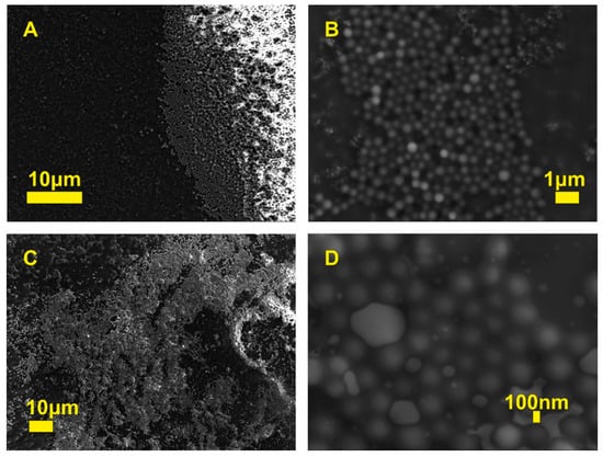 SEM images of HFBMA NPs at different magnifications: H26 (A,B), H27 (C,D).