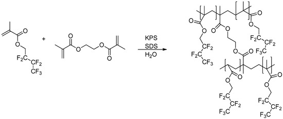 The chemical composition of the NP films was confirmed by XPS measurements on partially covered glass slides. The NP films were fabricated as follows. First, the surface of the glass slides was cleaned and activated. Next, the NP films were formed by depositing drops of stock solution of appropriate NPs. The samples were allowed to dry on the glass slides in the N2 flow box. All of them have been tested both by XPS and CA analysis. In the present study, HFBMA core and core–shell NPs were prepared by radical polymerization in the presence of ethylene glycol-di-methacrylate (EGDMA) as a cross-linker (Figure 5).