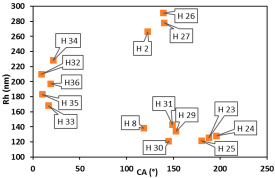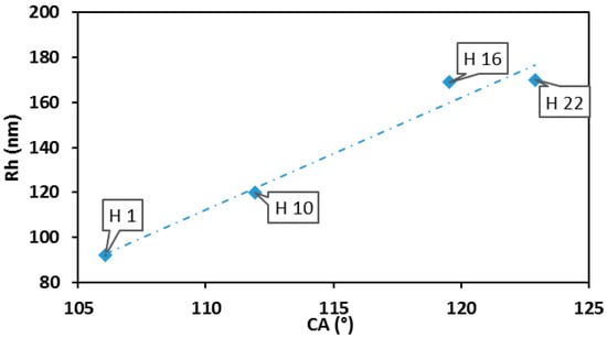 Static contact angles (°) HFBMA NP thin films versus Rh (nm) of HFBMA NPs.