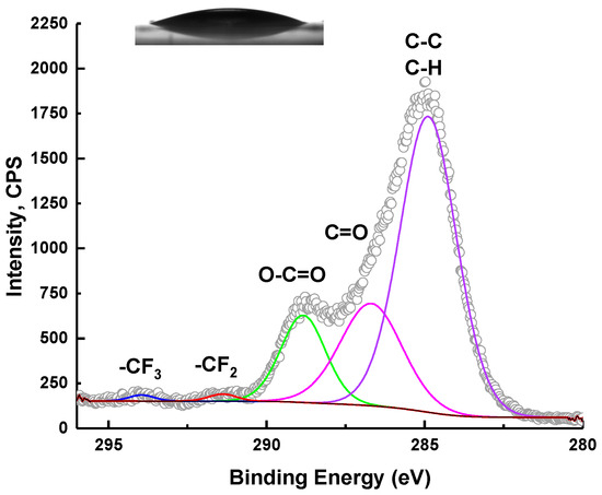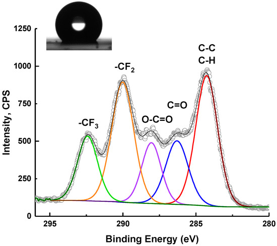 C 1s XPS spectra with static water contact angle (118°) of H8 NP films on modified glass slides.