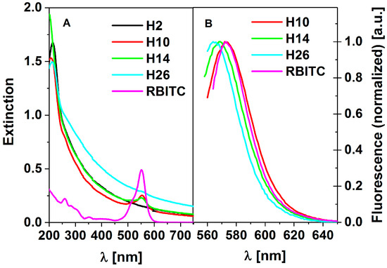Extinction (A) and normalized fluorescence (B) spectra of H2, H10, H14, H26, and RBITC samples; no fluorescence for H2 was observed (B).