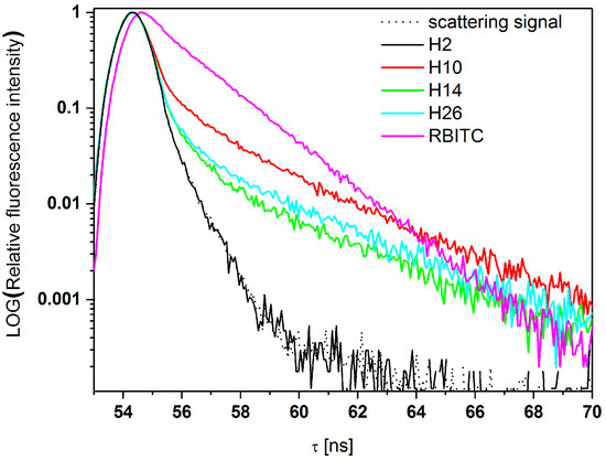 From Figure 11, it follows that HFBMA polymer NPs do not show fluorescence, but only scatter light similarly to a scattering standard. The scattering process is also manifested by the first curved region of the time decay curve for HFBMA+RBITC samples. Due to negligible scattering efficiency, the curved shape is hardly noticeable for the RBITC solution itself. The kinetics are linear in the whole detection range.