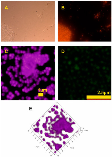 Microscopic images of HFBMA NPs: bright field microscopy (A), epifluorescence microscopy (B), confocal laser scanning microscopy (C), STED (D), a 3D picture from CLSM (E).
