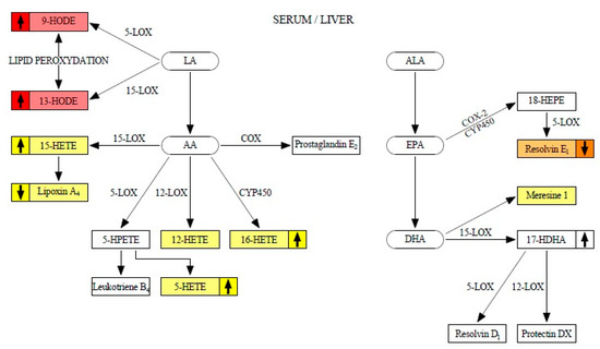 Figure 1 shows the metabolism of eicosanoids analyzed during the study. The metabolites with weak liver-serum correlations are marked in yellow. The moderate correlation is marked in orange. Strong liver-serum correlations are marked in red. The up/down arrows indicate a tendency to increase/decrease particular eicosanoid concentration during steatosis progression.