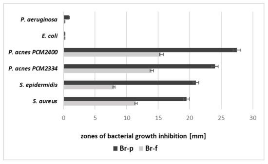 The narrow spectrum demonstrated by burdock root samples, limited only to Gram-positive bacteria, may be beneficial. It suggests that chemotherapy with a single drug may be used in the fight against acne, which is preferred for the identified pathogen, minimizes the impact on the body’s physiological flora, and reduces side effects and toxicity. Our tests also showed that a Br-p sample in an acid environment pH (BHI broth and BHI agar pH 6.0) had antibacterial activity. This is a promising result and therapeutically useful for cosmetic formulations requiring acidic pH. Besides, antibacterial peptides active under acidic conditions have a protective effect against bacterial infections (the skin, oral cavity, urinary tract, and vagina possess acidic pH). A Korean team [36] noted that the high antibacterial properties of Nod1 and Nod2 peptides isolated from Nordotis discus in an acidic environment might be useful when these peptides are applied as skin therapy in pH of about 5.5.