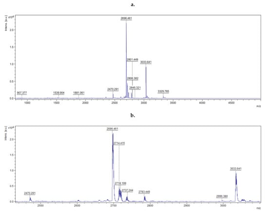 In the next stage of the study, the MS spectrum of the peptide mixture was assessed by MALDI-TOF. The obtained spectrum was smoothed, and the list of peaks for the signal-to-noise ratio was digitally generated (Figure 2, Figure S1).