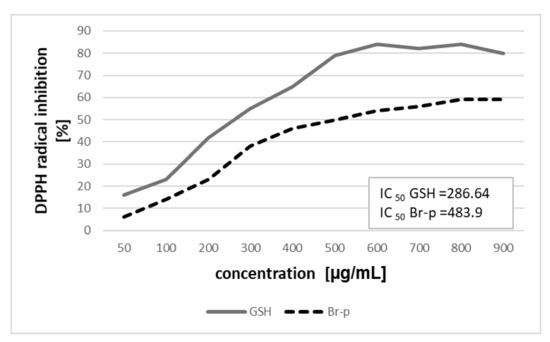 The present study evaluated the antioxidant activity of Br-p samples by employing a diphenylpicrylhydrazyl (DPPH●) (Sigma-Aldrich, USA) radical scavenging assay based on the Abdel Moneim method [53]. This assay was conducted spectrophotometrically in 96-wells plates using digital reader Bio Tech Synergy (USA). Color disappearance of DPPH (100 μL 0.1 mM in 95% ethanol) after 20 min was monitored at 517 nm. This DPPH decolouration, or lack thereof, was caused by the presence of 10 μL tested samples in the concentration range 50–800 µg/mL. Due to the precipitate formed (in some samples) during incubation (as a result of the ethanol of DPPH with the sample combination), after 20 min of incubation the mixture had to be centrifuged, the sediment rejected, and the clear solution read in a clean 96-well plate. Ascorbic acid and glutathione (GSH) were used as standards for the 2,2-diphenyl-1-picrylhydrazyl scavenging assay. The following equation was used to calculate the percentage of DPPH decolorization of the sample: