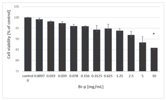 The graph of the human fibroblasts (BJ) viability depending on the concentration of Br-p against a control; * statistically significant results compared to the control.