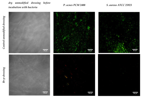Confocal laser-scanning microscope (CLSM) images showing biofilm formation on unmodified and Br-p-modified dressings determined in a confocal microscope; magnification 400×; scale bar = 40 µm.
