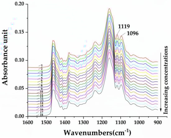 FTIR spectra of pure CAO and CAO/RSO admixtures (1–90% v/v) in the region of 1600–900 cm−1. 1. Pure CAO; 2. 1%; 3. 3%; 4. 5%; 5. 10%; 6. 15%; 7. 20%; 8. 25%; 9. 30%; 10. 35%; 11. 40%; 12. 45%; 13. 50%; 14. 60%; 15. 70%; 16. 80%; 17. 90%; (18) pure RSO.