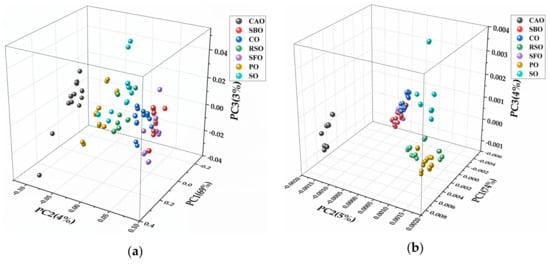 Figure 4a represents the three-dimensional (3D) score plot obtained from PCA using the full spectral range of 4000–650 cm−1. The first principal component (PC1) explained 69% of the variance, while the second (PC2) and the third (PC3) explained 4% and 3%, respectively; therefore, approximately 76% of variance could be described by the three principal components. Combining spectral ranges of 3050–2750 cm−1 and 1800–650 cm−1, PCA was completed with three PCs accounting for 83% of the explained variance (PC1, 74%; PC2, 5%; PC3, 4%) (Figure 4b). In Figure 4c, PCA was constructed in the region of 3050–2750 cm−1. Three PCs of the model accounted for 74% of the explained variance (PC1, 66%; PC2, 5%; PC3, 3%). Another three PCs (PC1, 86%; PC2, 4%; PC3, 3%) were obtained by conducting score plots on the fingerprint region (1800–650 cm−1) (Figure 4d); they explained 93% of the total variance. As in the score plot of Figure 4, CAO and other vegetable oils occupied different positions; thus, PCA allows qualitative discrimination between CAO and its adulterant under analysis. However, in Figure 4a, PO, SO, and RSO were hard to separate clearly as were CO, SBO, and SFO; CO, SBO, and SFO clustered together (Figure 4b), and CO, SBO, and SFO were very close to each other, as shown in Figure 4c; therefore, they would be very difficult to distinguish using infrared spectroscopy. In Figure 4d, each oil occupied a different position, thus making these oils distinguishable from each other. Consequently, the FTIR region of 1800–650 cm−1 had a much better ability to differentiate the edible oils under analysis.