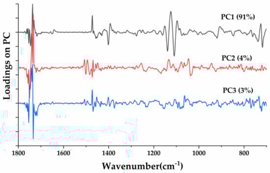 The loading spectra were utilized to identify the wavenumbers that had the most influence on a particular component that was responsible for differentiation of pure CAO and its adulterants. Both positive and negative score values of a specific wavenumber loading represent the usefulness of the contribution of each wavenumber. The loading plot in Figure 6 shows an analysis of the first three PCs applied for the classification of the CAO and RSO/CAO admixtures above. The data showed that wavenumbers of 1744 (C=O stretch), 1464 (methylene C–H bending; methyl C–H deformation), 1377 (methyl C–H bending), 1155 (C–O stretch), 1160 (methylene C–H bending), 1119 (C–O stretch), 1096 (C–O stretch) and 721 cm−1 (cis-CH=CH bending out of plane) had relatively large absolute score values, which indicated that these wavenumbers were the most important wavenumbers for the formation of principal components. Therefore, these major wavenumbers could be utilized for further classification and differentiation of CAO from its RSO adulterants.