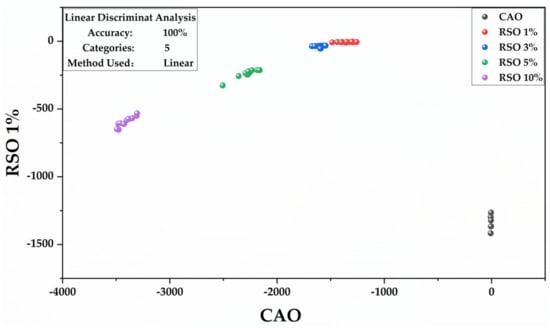 To assess the classification ability of CAO adulteration with RSO, we developed an LDA model with a subset of samples constituted by CAO adulterated with 10%, 5%, 3%, and 1% v/v of RSO and pure CAO. The LDA was constructed based on the seven selected wavenumbers (1744, 1464, 1377, 1155, 1119, 1096, and 721 cm−1) mentioned in the loading plot (Figure 6). The sample subset of the calibration set included 15 replicates of every group. Figure 7 shows the similarity plot as defined by the first two discriminant factors that had the most important role in the classification of CAO and its adulterants. The groups with RSO 10%, RSO 5%, RSO 3%, RSO 1% v/v, and pure CAO were clearly separated and positioned at different regions; there was no overlap. The confusion matrix obtained from LDA showed that all of the initial groups were 100% classified (Supplementary Table S2).