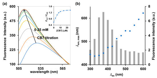 (a) Fluorescence spectrum and (inset) ratiometric change (F512/F530) of AOH+ (5 μM) upon addition of CB7 (0–25 μM) in 10 mM ammonium acetate buffer (pH 4.0), λex = 498 nm. (b) Autofluorescence of Cordyceps militaris extracts at different excitation wavelengths (λex). The left and right y-axes represent the maximum emission wavelength (λem,max, blue circle) and the corresponding fluorescence intensity (gray bar), respectively.