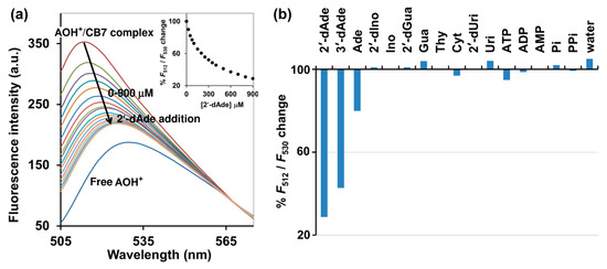 (a) Fluorescence spectrum of AOH+/CB7 complex upon addition of various concentrations of 2′-dAde. The percentages of change (F512/F530) are shown in the inset. (b) % change (F512/F530) of the AOH+/CB7 complex upon addition of various analytes at 900 μM. Measurement condition: 5 μM AOH+, 10 μM CB7, 10 mM ammonium acetate buffer (pH 4.0). λex = 498 nm. Pi: inorganic phosphate; PPi: inorganic pyrophosphate.