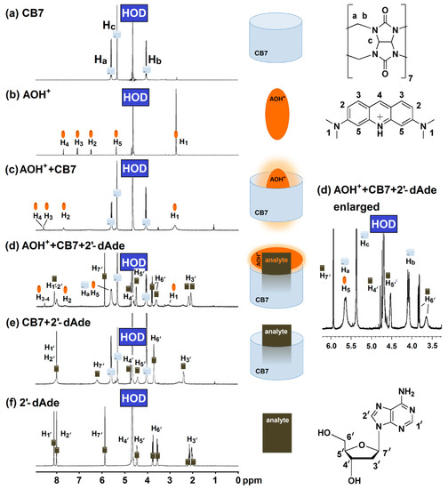 Proton nuclear magnetic resonance (400 MHz, D2O) spectrum of (a) CB7 (4 mM); (b) AO (2 mM); (c) mixture of AO (2 mM) and CB7 (4 mM); (d) mixture of AO (4 mM), CB7 (4 mM) and 2′-dAde (4 mM); (e) mixture of CB7 (4 mM) and 2′-dAde (4 mM); (f) 2′-dAde (20 mM).