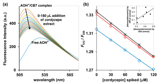 Addition of an aqueous extract of the commercially available Cordyceps and Ohiocordyceps products to the AOH+/CB7 inclusion complex resulted in fluorescent quenching accompanied by the red shift from 512 to 530 nm (Figure 6a). This suggests that cordycepin present in the sample could switch the AOH+ molecule from an inclusion complex to the Exo complex, as also demonstrated by 1H-NMR and UV-Vis spectroscopy. The fluorescence change (F512/F530) was linearly correlated with the amount of cordycepin spiked, with the R2 > 0.99 (Figure 6b). The concentrations of cordycepin determined by HPLC were slightly lower than the values obtained from our IDA method, but both still exhibited some agreement despite the large variety of ingredients in the commercially available Cordyceps and Ophiocordyceps products (Figure 6b inset). Taken together, the bioactive cordycepin with several reported health benefits can be evaluated in commercial Cordyceps and Ohiocordyceps products using tripartite IDA with AOH+/CB7 as a reporter pair in 10 mM ammonium acetate buffer (pH 4.0) as an approximate analysis. Besides its rapidity, the newly developed IDA method is also environmentally-friendly because it produced less chemical wastes—the volume of each assay is limited to only 3 mL, in contrast to conventional HPLC techniques which demand large amounts of mobile phase for column conditioning, sample elution, and post-assay column cleaning [26]. The method will be highly suitable for quality control of the Cordyceps and Ohiocordyceps commercial products, especially in the production line.