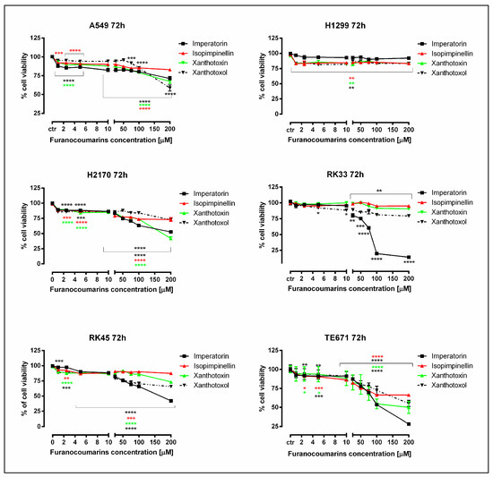Antiproliferative effect of furanocoumarins: imperatorin, isopimpinellin, xanthotoxin, and xanthotoxol in human lung cancer (A549, H2170 and H1299), larynx cancer (RK33 and RK45), and rhabdomyosarcoma (TE671) cells. The cancer cells were exposed to either culture medium alone (control) or furanocoumarins (1–200 µM) for 72 h. Normalized cell viability measured by the methylthiazolyldiphenyl-tetrazolium bromide (MTT) assay is presented as mean ± SEM at each concentration. Tukey’s test revealed significant effect (* p < 0.05; ** p < 0.01; *** p < 0.001; **** p < 0.0001) of treatment with furanocoumarins compared with the control group. This effect was also concentration-dependent, as judged by analysis of variance (ANOVA) test (**** p < 0.0001), n = 24 per concentration from three independent experiments.