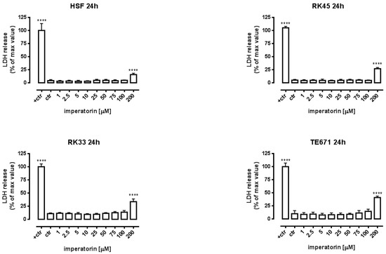 Cytotoxicity of imperatorin to normal human skin fibroblasts (HSFs), larynx cancer (RK33 and RK45), and rhabdomyosarcoma (TE671) cells. Lactate dehydrogenase (LDH) ELISA kit was used to quantify cytotoxicity by measuring LDH activity released from damaged cells. HSFs were incubated for 24 h alone or in the presence of imperatorin (1–200 µM). The results are presented as the percentage in LDH release to the medium by treated cells versus cells grown in control medium (ctr) and cells treated with lysis buffer (ctr+). Data are presented as mean mean ± SEM at each concentration. **** p < 0.0001 vs. control group (Tukey’s test), n = 24 from three independent experiments.