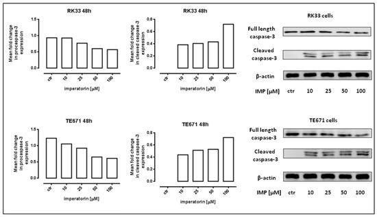 Western blotting analysis of the full length and cleaved caspase-3 activities following 48h incubation of RK33 and TE671 cells with either culture medium alone (control) or imperatorin (IMP) (10–100 µM). β-actin was used as a gel loading control. The right panel shows representative blots; the left panel shows a densitometry analysis of the bands.
