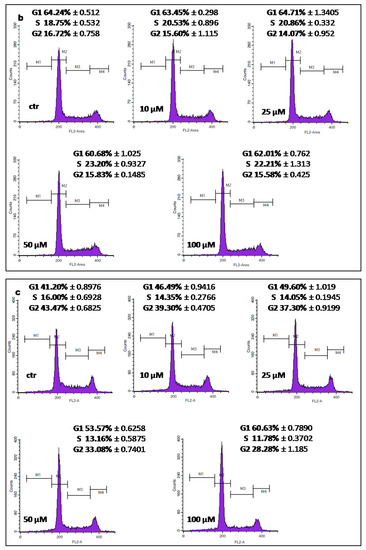 Representative histogram plots of the flow cytometry analysis (DNA content) of RK33 (a), RK45 (b), and TE671 (c) cells upon imperatorin treatment. Results are presented as mean ± SEM, n = 9 per concentration from three independent experiments.