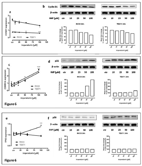 Parallel to the changes in cell cycle progression, we observed a significant effect of IMP on the expression of genes (TP53, CDKN1A, and CCND1) coding for the key cell cycle regulatory proteins p53, p21Waf1/Cip1, and cyclin D1, respectively, in TE671 and RK33 cancer cell lines. As shown in Figure 6, the expression of CDKN1A was equally upregulated in a dose-dependent manner in both cancer cell lines and increased threefold (RK33 *** p < 0.001; TE671 **** p < 0.0001) versus the control in the presence of 100µM IMP. There was a slight downregulation of CCND1 expression in both TE671 and RK33 cell lines. These results were further confirmed by Western blot analysis. Quantitative real-time expression analysis (qPCR) also revealed a statistically significant increase in TP53 mRNA expression in TE671 cells (*** p < 0.001), but not in R33 cells.