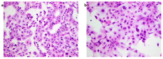 Hematoxylin–eosin (H–E) staining for laryngeal cancer cell lines RK33 (a) and RK45 (b).