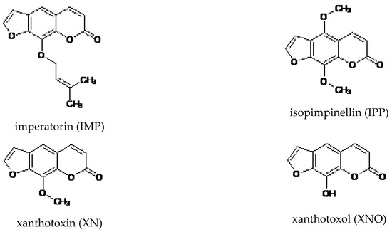 IPP and XNO, as structure analogues of furanocoumarins, were delivered from Sigma Aldrich. Stock solution of studied furanocoumarins was prepared in DMSO (Sigma Chemicals, St. Louis, MO, USA). The chemical structures of analyzed coumarins are presented in Figure 8.