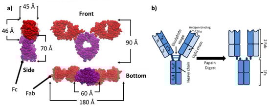 A model bioengineered mAb that has been extensively studied is designated as COE-3. It is very similar to the humanized IgG1k 1HZH whose crystalline structure has been determined with high resolution [34] and the side view, front view and bottom view are shown in Figure 2a, with the approximate dimensions of 45 × 90 × 180 Å. The full-length human IgG1κ has the molecular weight of 145,560 Da (assuming average glycans) and an isoelectric point (pI) of 8.44. The molecule contains several regions: Two Fab (fragment antigen-binding) and one Fc (fragment crystallizable), linked together by a disulphide hinge, as schematically shown in Figure 2b. The Fc of COE-3 has the same sequence as IgG1κ but its Fab region has only ≈75% sequence identity to the wild type [35]. One Fc and two Fab fragments can be obtained from one COE-3 molecule through papain digestion (enzymatic cleavage) by cutting the hinge as illustrated in Figure 2b; this enables us to examine the adsorption behaviour of the individual domains. The free Fc and Fab segments can be separated and purified from the digestion product by chromatography (protein A affinity capture followed by ion exchange) and then buffer exchanged and concentrated by ultrafiltration. Bioengineered mAbs do not have to be confined to the same domain architecture and therefore their molecular weights deviate from wild type antibodies. Depending on design principles, mAbs may be engineered with additional single chain variable fragment (scFv) to impart bispecific functionality [36]. In the context of this review, we will focus on mAbs with molecular weights close to the wild type IgG1.