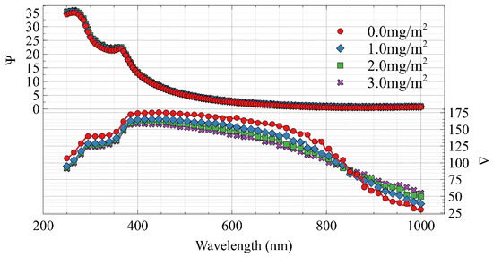 where is the complex reflectivity of the p polarized light and is the complex reflectivity of the s polarized light. The result is that the amplitudinal component is related to Ψ and the phase information is captured in Δ. Figure 4 shows a simulation of a silicon wafer with a native oxide layer followed by mAb adsorption over a range of typical adsorbed amounts. One can see a subtle shift in the Ψ parameter and a larger shift in Δ.
