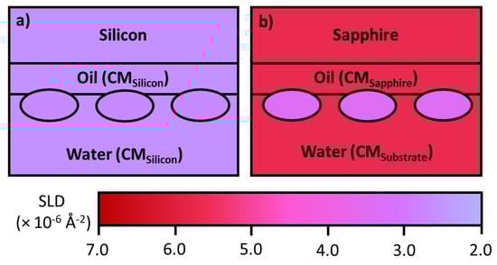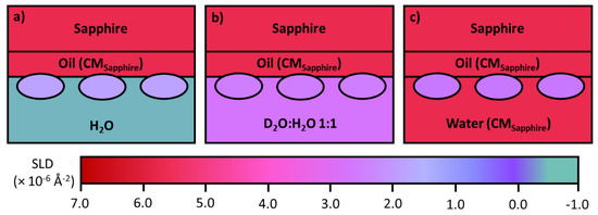 Parallel measurements in D2O and a 1:1 mixture of D2O and H2O are commonly used in protein adsorption at the air/water interface as it provides information about the protein layer volume fraction and surface penetration. The isotopic contrasts created by varying D2O and H2O are schematically shown in Figure 5. Another practical use of isotopic contrasts in neutron reflection is the ability to measure mAb adsorption at the oil/water interface. Often a silicon block is used as a substrate but sapphire is preferred in this case due to its greater SLD (5.75 × 10−6 Å−2) enabling a better contrast between it and the protein, schematically depicted in Figure 6.