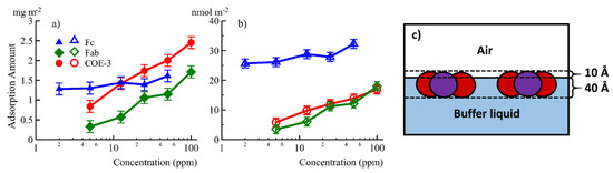 An interface commonly encountered in biopharmaceutical production and storage, so it is important to study interfacial adsorption and desorption of mAbs. Unfortunately, it is difficult to gain basic information such as the changes of adsorbed amount and layer thickness with time. We have studied the adsorption of COE-3 at the air/liquid interface using neutron reflection and surface tension experiments under different buffer conditions (mAb concentrations, pH and ionic strengths) [67]. We have also isolated and investigated the adsorption of the Fc and Fab segments of COE-3 [35]. The results implied that Fc and Fab have different interfacial properties, as shown in Figure 8a,b. Fab dominated the concentration-dependent mAb adsorption while both Fab and Fc contributed to the amount of mAb adsorbed. Using multiple contrasts (NRW, Contrast-Match-Antibody water (CM2.58) and D2O), the adsorbed layer structure and its immersion depth was revealed, as shown in Figure 8c. Our neutron reflection study has shown that NRW and CM2.58 could offer significant benefits in emphasising mAb and mAb fragments (e.g., Fab and Fc) at the interface by showing the entire adsorbed layer and the region out of the water surface, respectively. The Fc layer remained constant at 40 Å while Fab and mAb layers increased very little from 45 to 50 Å when mAb concentration increased from 5 to 50 ppm. On the other hand, the volume fraction of the adsorbed antibody increased from 40% to 56%, this results in quite a drastic change in adsorbed amount, as can be seen in Figure 8. These studies implied that the adsorbed mAb, Fc, and Fab all retained their globular structures and were oriented with their short axial lengths perpendicular to the air/liquid interface. The same measurement in D2O revealed how the adsorbed protein layers mixed with water. The results showed that for COE-3, its Fab and Fc were predominantly immersed in water once adsorbed.
