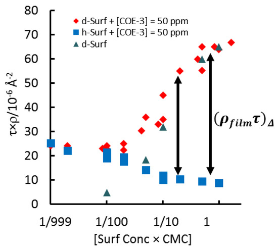 An attractive approach to prevent mAb adsorption on the surface of water is to add nonionic surfactant into the mAb solution. Nonionic surfactants do not tend to bind mAb to cause structural unfolding, but they are more surface active than mAbs and are expected to stop mAb adsorption by the competitive action. In our recent work [67], we mixed COE-3 with the nonionic surfactant, polysorbate 80 (PS 80) in different ratios, as it is the most common nonionic surfactant used in biopharmaceutical production. We undertook the neutron reflection measurements by fixing the mAb concentration at 0.050 mg/mL while varying the surfactant concentration from well below its CMC (critical micellar concentration) to 10 times the CMC, in both its hydrogenated and deuterated forms, in NRW. Measurements carried out under isotropic contrasts indicated that mAbs retained globular structure when either adsorbed alone or co-adsorbed with surfactants. But as the bulk concentration of the surfactant increases, its amount co-adsorbed on the surface increases. Figure 9 shows the plots of the product of τρ, where τ denotes the layer thickness and ρ denotes the total SLD of the layer, versus surfactant concentration. At the surfactant concentrations below 1/50CMC, there is little surfactant co-adsorption and the signals are consistent with the adsorption of the mAb.
