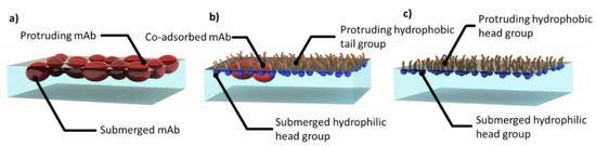 Schematic depiction of COE-3 adsorption at 0.050 mg/mL (a) on its own with a thickness close to 50 Å and most part of the layer being immersed in water, (b) co-adsorption with nonionic PS 80 surfactant (blue heads) when its concentration is below 1/20 CMC. (c) As the surfactant concentration moves above 1/20 CMC, the mAb is completely expelled by the surfactant.
