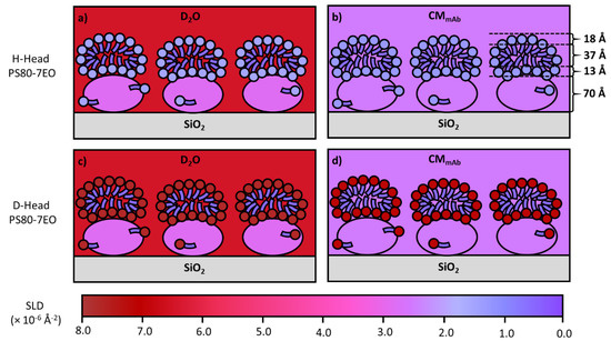 A schematic representation of the use of isotopic contrasts to highlight the structure of the interfacial layers formed by self-assembly of PS80-7EO on top of a COE-3 layer at the SiO2/water interface. Schematic (a) depicts the system in D2O solvent coupled with hydrogenated (H-PS80-7EO) nonionic surfactants, (b) depicts the system in CMAb (contrast matched to COE-3 with SLD = 2.56 × 10−6 Å−2) solvent coupled with hydrogenated (H-PS80-7EO) nonionic surfactants, (c) depicts the system in D2O solvent coupled with head deuterated (D-Head PS80-7EO) nonionic surfactant and (d) depicts the system in CMAb (contrast matched to COE-3 with SLD = 2.56 × 10−6 Å−2) solvent coupled with head deuterated (D-Head PS80-7EO) nonionic surfactants. The model schematics were based on simultaneous fittings of 4 reflectivity profiles measured under the 4 isotopic contrasts at the SiO2/water interface. COE-3 adsorption at 0.010 mg/mL mixed with 0.20 mg/mL protonated or deuterated PS80-7EO.