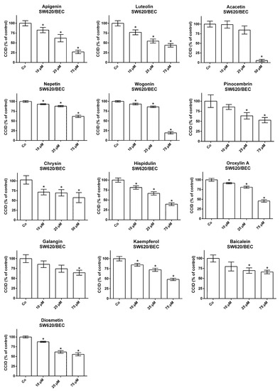 SW620 spheroids were pre-treated for 20 min with solvent (DMSO; Co) or the indicated concentrations of each flavonoid before placement on blood endothelial cell (BEC) monolayers and co-cultivation for 4 h. Then CCIDs were measured. Three parallel experiments were performed. For each concentration, a total of 15 replicates was analyzed. * p < 0.05.