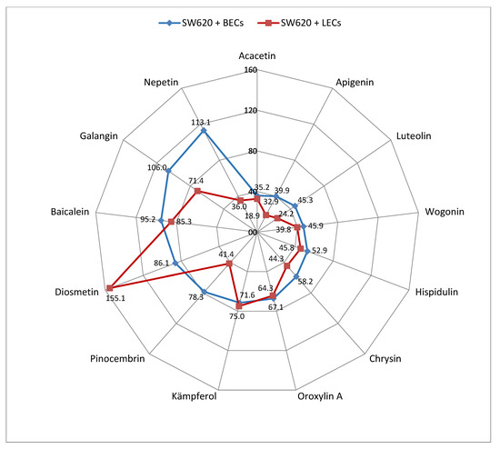 Inhibition of of CCID formation (IC50) values; µM) by studied flavonoids in the SW620/BEC (blue line) and the SW620/LEC model (red line) with at least one of them <90 µM. The results are the mean pooled from 3 independent experiments performed in 5-fold measurements (n = 3).