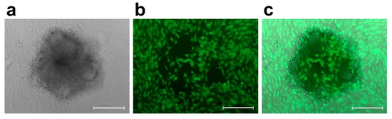 After four hours of incubation of the SW620 spheroids-LEC monolayer co-cultures or 3 h in case of SW620 spheroids-BEC monolayer co-cultures, the CCIDs in the LEC or BEC monolayer underneath the spheroids were photographed with an Axiovert (Zeiss, Jena, Germany) fluorescence microscope to visualize cytotracker (green)-stained LECs or BECs underneath the spheroids (Figure 4 and Figure 5) [10,34].