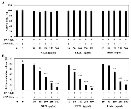 Briefly, the RBL-2H3 cells were seeded in a 24-well plate (1 × 105 cells/well) in MEM medium supplemented with 10% FBS, and cultured overnight at 37 °C. The cells were washed with 1 × PBS, and subsequently incubated with anti-DNP-IgE (0.05 μg/mL) for 24 h. The IgE-sensitized cells were incubated with varying concentrations of tricin or ETZL (0–500 ng/mL or 0–500 μg/mL, respectively) for 1 h. DNP-HSA (0.1 μg/mL) was then added to the wells, and the mixture was incubated for a further 4 h. To measure cell viability, the absorbance was measured at 550 nm using a well-plate multi-reader.