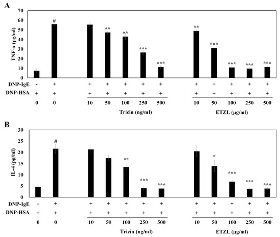 Effect of tricin and ETZL on pro-inflammatory cytokines in IgE-mediated RBL-2H3 cells. (A) Tumor necrosis factor (TNF)-α secretion; (B) IL-4 secretion. IgE-sensitized RBL-2H3 cells were pre-incubated with tricin or ETZL for 1 h before antigen treatment for 4 h. All values are the mean ± S.E.M. of three independent experiments. Values of * p < 0.05, ** p < 0.01 and *** p < 0.001 were considered significantly different to the anti-DNP IgE plus DNP-HSA, unpaired Student’s t-test. # p < 0.001 compared to the control.