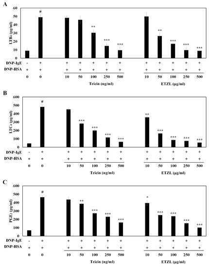 Inhibitory effect of tricin and ETZL on formation of leukotrienes (LT)B4, LTC4 and prostaglandin E2 (PGE2) in RBL-2H3 cells stimulated by an IgE–antigen complex. (A) LTB4 secretion; (B) LTC4 secretion; (C) PGE2 secretion. RBL-2H3 cells were seeded in a 24-well plate and cultured overnight at 37 °C; cells were subsequently washed and further incubated with anti-DNP-IgE (0.05 μg/mL) for 24 h. The cells were incubated with tricin (10–500 ng/mL) or ETZL (10–500 μg/mL) for 1 h, followed by stimulation with DNP-HSA (0.1 μg/mL) for 4 h. All values are the mean ± S.E.M. of three independent experiments. Values of * p < 0.05, ** p < 0.01 and *** p < 0.001 were considered significantly different to the anti-DNP IgE plus DNP-HSA, unpaired Student’s t-test. # p < 0.001 compared to the control.