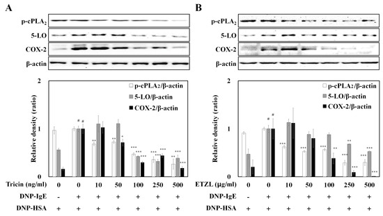 We further investigated the effects of tricin and ETZL on the activation of enzymes involved in the synthesis of eicosanoids, including cPLA2, 5-LO and COX-2, in IgE-activated RBL-2H3 cells. Both samples inhibit the phosphorylation of cPLA2, 5-LO and COX-2, as seen in Figure 5A,B, suggesting that tricin and ETZL suppress the formation of arachidonate metabolites through inhibition of 5-LO (an early enzyme in leukotriene synthesis) and COX-2 expression (the rate-limiting enzyme in prostaglandin synthesis).