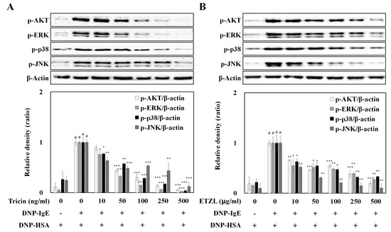Effect of (A) tricin and (B) ETZL on phosphorylation of proteins in the mitogen-activated protein kinase (MAPK) signaling cascade, in IgE-activated RBL-2H3 cells. IgE-sensitized RBL-2H3 cells were exposed to tricin or ETZL for 1 h, and subsequently stimulated by antigen for 10 min. All values are the mean ± S.E.M. of three independent experiments. Values of * p < 0.05, ** p < 0.01 and *** p < 0.001 were considered significantly different to the anti-DNP IgE plus DNP-HSA, unpaired Student’s t-test. # p < 0.001 compared to the control.